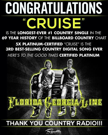“Cruise”: #1 for 3 weeks (22 weeks and counting at #1 on Hot Country Songs)