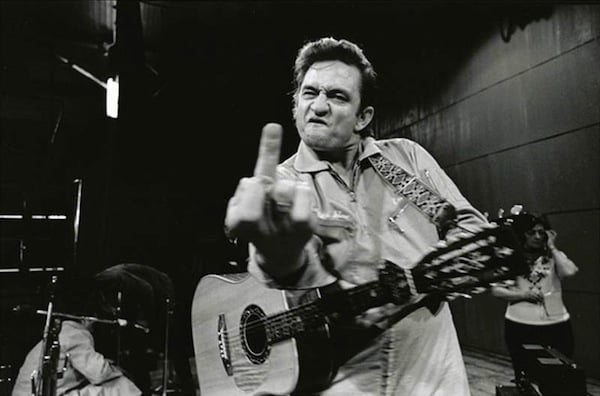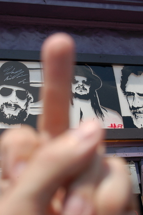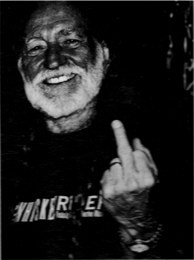Willie Nelson’s middle finger photo was shot by a photographer named Sean Moorman on Willie Nelson’s tour bus on July 26, 2002. The title of image is “Willie Nelson Sending Jim Marshall Regards.” Both the Jim Marshall photo of Johnny Cash and the Sean Moorman photo of Willie stimulated litigation when Urban Outfitters printed up Johnny Cash middle finger T-shirts without permission, and Spencer Gifts did the same with Willie.