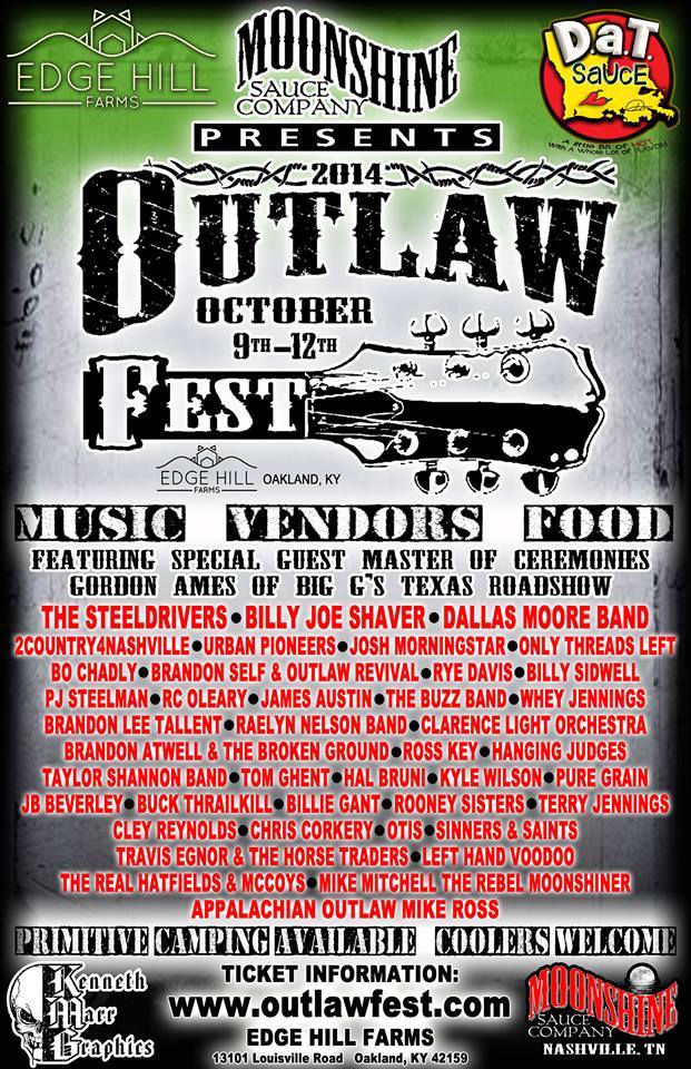 What started out as a way to promote his barbecue sauce has turned into a full blown 4-day festival with over 40 bands. Already the festival was forced to move from its original location of the Wishbone Rance to Edgehill Farm because of the expected turnout. “Our goal on the whole thing is that if we break even, then there will be an Outlaw Fest 2015. Everybody wants it to be an annual event and that’s a good thing. Because people see that we’re doing everything we can do to do it up right. I don’t know anything else to do that we’ve not done. But the long-range goal is to make this an annual event that will rival anything else out there.”