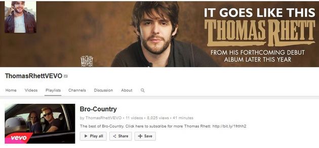 Wait, wait, hold on for just a second. Before we go any further with the Thomas Rhett comments, let’s take a closer look at this stinker that he tells us right off the bat. Has Thomas Rhett really never used the term ‘Bro-Country?” Because I seem to remember Thomas Rhett specifically setting up a self-defined “Bro-Country” playlist touting “The best of Bro-Country” under his YouTube Vevo account months ago. It included his song “Get Me Some Of That” with other Bro-Country anthems such as Florida Georgia Line’s “Cruise” and Luke Bryan’s “That’s My Kind of Night”. In fact I used Thomas Rhett’s Bro-Country YouTube playlist as the very first example of how Bro-Country was becoming a term of endearment in an article posted back in April.