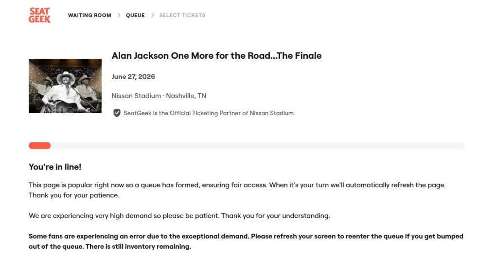 “Some fans are experiencing an error due to the exceptional demand. Please refresh your screen to reenter the queue and keep your place in line if you get bumped out of the queue. There is still inventory remaining.“