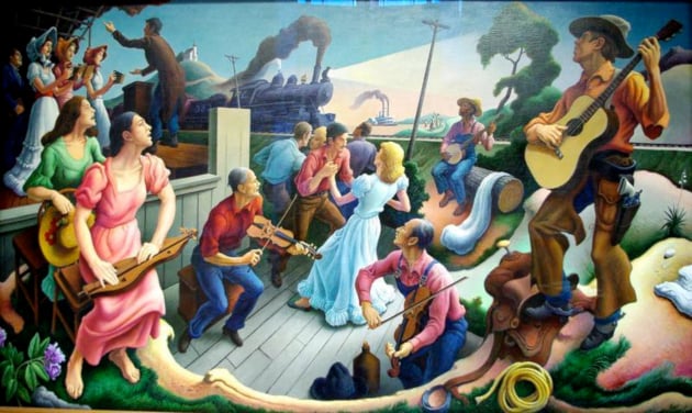 The painting is the work of Thomas Hart Benton from Missouri, who was part of the Regionalist art movement most popular in the mid 30’s. Benton painted many well-known pieces, including other murals that depicted multiple characters in his very sculpted, rounded-off style that was his signature, and was well-regarded in his time. Thomas Benton is responsible for numerous famous paintings, including Achelous and Hercules that he finish in 1947, and now hangs in the Smithsonian Art Museum in Washington.
