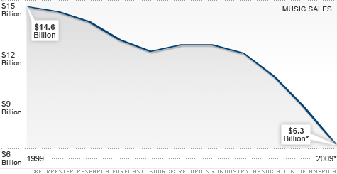 I think the music industry was in a tailspin way before the economic downturn. Check the above chart. How the downturn effects the music industry now is that the capital that must keep flowing to keep the executive pays and posh office buildings alive on Music Row could get pulled quicker, especially when it is obvious the returns are dwindling at a monstrous pace.