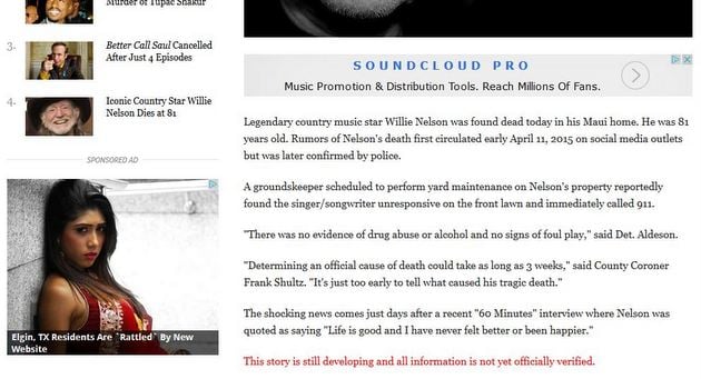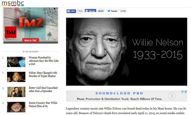 Willie Nelson death hoaxes are popular with such misleading sites. Another website called mediamass.net (that may be associated with msmbc.co) published another death story on or around February 21st, 2015 that also went viral. Making the deed even more sinister, after the death story went viral, mediamass.net turned around and debunked their own myth by posting a new story about the hoax, causing their myth-busting story to go viral as well, getting unsuspecting readers both coming and going, and undoubtedly making lots of revenue from ads on the articles. There’s a good chance the msmbc.co article could pull the same tactic in the future.